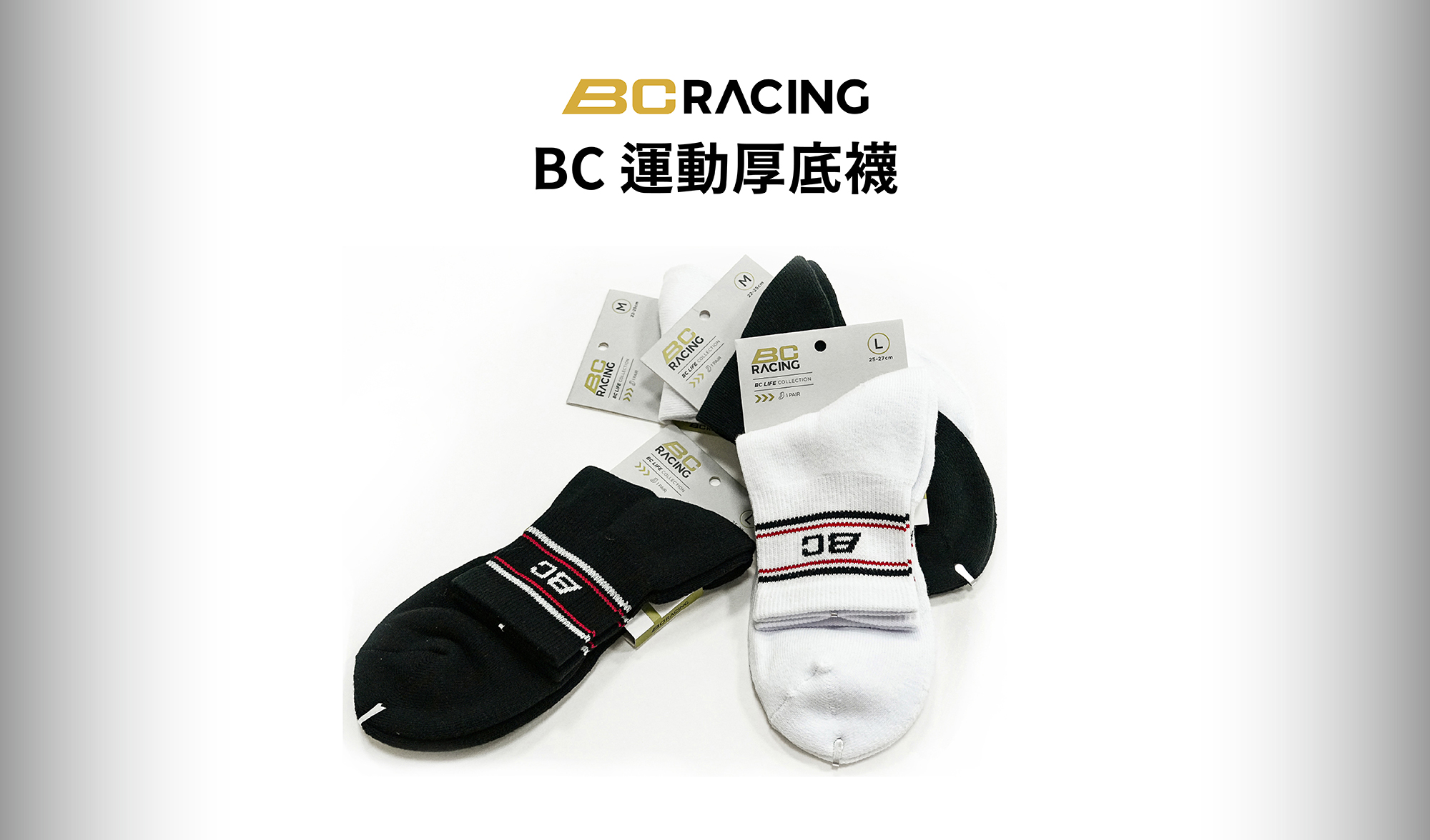 BC RACING 運動厚底襪 • 品牌:BC RACING • 尺寸:請參考蝦皮網站圖片尺寸表 • 商品描述: 成分:88%棉、12%彈性紗 顏色:黑 / 白 尺寸:M (22-25cm) / L (25-27cm) 用途:慢跑 / 登山 / 運動 / 旅遊 / 戶外活動 / 休閒 特點:厚底毛巾襪 / 親膚高棉織品 / 立體足跟設計 / 全天候舒適 (因測量尺寸方式不同,1-2cm誤差屬正常範圍,請以實品為主) < BACK